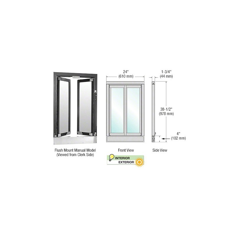 Les guichets transactionnels à vantaux pliants CRL répondent parfaitement aux besoins en matière de guichets à vantaux pliants de qualité supérieure. Parmi les caractéristiques de ce produit figurent notamment deux panneaux qui s'ouvrent simultanément vers le client et des barreaux pour un niveau de sécurité accru. Des modèles projetés et à montage en affleurement sont disponibles dans trois configurations différentes : Manuel - Les deux panneaux bougent simultanément lorsque l'un des deux est manipulé. SEMI-AUTOMATIQUE - Le guichet s'ouvre en poussant sur la barre coulissante à hauteur de hanche. Il suffit de s'éloigner du guichet pour que les deux panneaux se referment automatiquement. ENTIÈREMENT AUTOMATIQUE - Il suffit simplement de passer devant le capteur infrarouge intégré pour ouvrir le guichet. Il suffit de s'éloigner pour que les deux panneaux se referment automatiquement. L'interrupteur Automatique/Arrêt/Manuel permet trois réglages différents : La fonction AUTOMATIQUE est activée grâce à un dispositif de détection infrarouge ; la fonction MANUELLE est activée grâce à un bouton poussoir monté sur huisserie ; enfin la fonction OFF (arrêt) annule toutes les fonctions et provoque la fermeture des deux panneaux. Transformateur classe 2, certification UL/CSA Des dimensions sur mesure et des coloris personnalisés sont disponibles sur commande spéciale. Veuillez contacter le service technico-commercial CRL au (800) 421-6144 depuis les États-Unis ou au (877) 421-6144 depuis le Canada et demander le poste 7700, ou par e-mail. Données techniques :