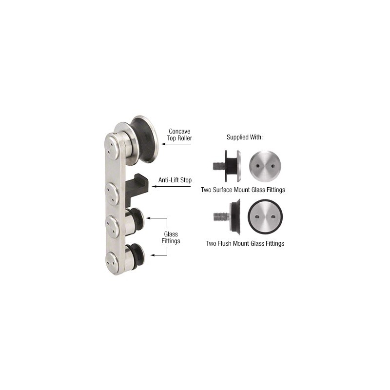 Two CRL Laguna Series Anti-Lift Top Rollers are needed for each sliding door panel. These will be placed on the Cat. No. LS104BS Top Sliding Tube after it has been mounted to the glass panels or wall. The door panel is then positioned and attached to the Rollers. Anti-Lift Top Rollers will allow for 1/8" (3 mm) up or down adjustment for final alignment. Rollers are supplied with both Surface Mount and Flush Mount Fittings so the glass fabrication choice is yours.