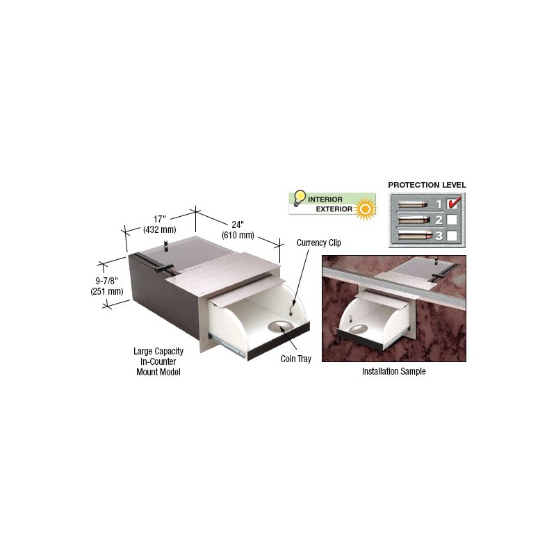 Nos tiroirs transactionnels CRL de grande capacité montés sur comptoir sont parfaitement adaptés aux services à l'auto et au guichet. Un couvercle en Lexan permet de voir le contenu tout en évitant toute pénétration d'air extérieur. Le panneau avant en acier inoxydable pivote vers le haut quand le tiroir est tiré. Le tiroir est résistant aux intempéries. Un loquet à bouton poussoir maintient les couvercles des tiroirs verrouillés à la fermeture. Le tiroir transactionnel très grande capacité est parfait pour des magasins de proximité et permet de transférer 4 litres de lait ou 2 bouteilles de soda. Les tiroirs transactionnels encastrés très grande capacité existent en modèles sur comptoir ou encastré dans un mur. Tous les tiroirs sont conformes aux prescriptions du niveau de protection 1.