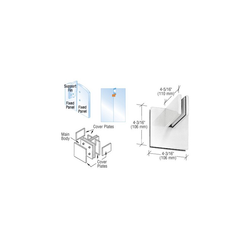This CRL Patch Connector with Support Fin Bracket is used for joining a two lite glass junction that needs extra support to achieve the required structural strength. The support fin glass should be sized to approved criteria (refer to GANA or Manufacturer's Manual), and secured to the ceiling with a PH94 Ceiling Mounted Support Fin Bracket.