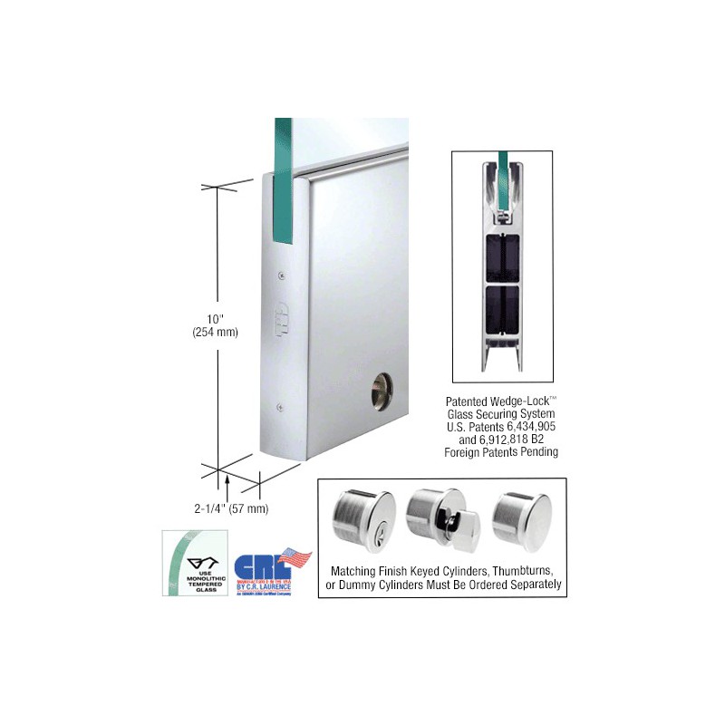 DR10SPS34SL CRL Profil de porte carr, avec serrure, 254 mm (10 po), verre de 19,1 mm (3/4 po) d'paisseur, acier inoxydable poli - 910 mm (35-3/4 po) de long