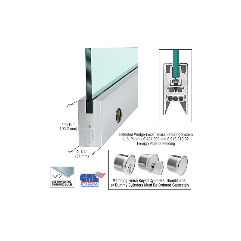 Système d'entrée en verre innovant, le dispositif de profilé de porte à système de verrouillage Wedge-Lock CRL est doté du système exclusif de verrouillage Wedge-Lock CRL (brevets américains 6,434,905 et 6,912,818 B2. Brevet canadien 2,419,706), un concept totalement nouveau pour fixer le verre dans le profilé de la porte. Fonctionne en appliquant une pression sur la partie inférieure du profilé de porte, à l'aide de deux profilés de retenue de verre en aluminium actionnés par une barre plate en acier inoxydable. Lorsque cette barre est abaissée à l'aide des boulons à six pans creux, une pression est appliquée sur les profilés de retenue du verre en aluminium. L'angle de la partie inférieure des profilés correspond à la rainure en angle du profilé de la porte. Lorsque les profilés de retenue du verre sont abaissés, le coin en biais du profilé de la porte permet de rassembler les profilés de retenue du verre. Cette action, accompagnée de notre joint de fixation spécial pour porte, permet de générer une force considérable (plus de 408,23 kg - 900 lb) au niveau de notre profilé d'angle de 228,6 mm (9 po). Soit 45,36 kg (100 lb) par 25 mm (1 po). Imaginez l'intensité de la force exercée sur nos profilés de porte de 908 mm (35-3/4 po) de long (pleine longueur) ! Le système de verrouillage Wedge-Lock pour verre vous offre plus qu'une fixation solide sur verre. Permet l'installation la plus rapide de tous les systèmes de profilés de portes du marché. Des installateurs expérimentés peuvent préparer une porte pour son installation en moins de dix minutes. Les profilés de porte à système de verrouillage Wedge-Lock CRL sont entièrement usinés et prêts à être installés grâce aux embouts déjà fixés. Après avoir installé le profilé et avant d'installer la porte, il suffit de fixer le bras de la porte ou le pivot (non compris) dans la glissière réglable d'alignement de la porte, déjà montée dans le profilé de la porte. Le système réglable d'alignement de porte vous permet de régler la porte de 3,2 mm (1/8 po) en l'éloignant ou en la rapprochant de l'huisserie, sans avoir à la retirer. Il s'agit d'un standard pour les profilés inférieurs et supérieurs. Après l'installation de la porte, il vous suffit de retirer l'embout pour régler la porte. Trois boulons à six pans creux apparaîtront. La fixation centrale est représentée par un boulon de fixation qui permet d'installer solidement la glissière réglable. Les deux boulons de fixation externes permettent de régler la glissière de 3,2 mm (1/8 po) vers l'intérieur ou l'extérieur. Le profil bas de la glissière réglable permet aux pivots à fente de se déplacer vers une position autre que la position déportée propre à la norme américaine, qui est de 69,8 mm (2-3/4 po). Cela signifie qu'il est possible de les usiner pour des ouvertures verticales présentant un faux-équerrage. Autres raisons pour choisir les profilés de porte à système de verrouillage Wedge-Lock : Les modèles sont conçus pour du verre de 10 ou 19 mm (3/8 ou 3/4 po) d'épaisseur ; contrairement aux boîtiers composés de deux moitiés, les boîtiers rigides dotés d'un seul composant ne se déplacent pas et ne se dérèglent pas. L'installation ne nécessite pas de retirer les composants internes. Les pastilles de fixation du verre sont conçues pour une longue durée de vie dans des environnements extrêmes. Remarque : Tous les profilés de porte à système de verrouillage Wedge-Lock sont dotés d'un bloc d'alignement d'huisserie intégré. Les bras et les pivots doivent cependant être commandés séparément pour répondre aux exigences de la tâche. Les profilés de porte à système de verrouillage Wedge-Lock CRL sont disponibles dans plusieurs finis standard, et peuvent être fabriqués sur mesure dans des finis et des largeurs personnalisés. Les données techniques des profilés, les gabarits et les kits de quincaillerie sont disponibles auprès du service technico-commercial CRL. Pour plus d'informations, contactez-nous par e-mail ou appelez le (800) 421-6144, poste 7700 (numéro gratuit depuis les États-Unis).