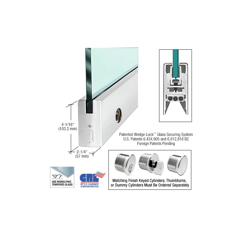 Système d'entrée en verre innovant, le dispositif de profilé de porte à système de verrouillage Wedge-Lock CRL est doté du système exclusif de verrouillage Wedge-Lock CRL (brevets américains 6,434,905 et 6,912,818 B2. Brevet canadien 2,419,706), un concept totalement nouveau pour fixer le verre dans le profilé de la porte. Fonctionne en appliquant une pression sur la partie inférieure du profilé de porte, à l'aide de deux profilés de retenue de verre en aluminium actionnés par une barre plate en acier inoxydable. Lorsque cette barre est abaissée à l'aide des boulons à six pans creux, une pression est appliquée sur les profilés de retenue du verre en aluminium. L'angle de la partie inférieure des profilés correspond à la rainure en angle du profilé de la porte. Lorsque les profilés de retenue du verre sont abaissés, le coin en biais du profilé de la porte permet de rassembler les profilés de retenue du verre. Cette action, accompagnée de notre joint de fixation spécial pour porte, permet de générer une force considérable (plus de 408,23 kg - 900 lb) au niveau de notre profilé d'angle de 228,6 mm (9 po). Soit 45,36 kg (100 lb) par 25 mm (1 po). Imaginez l'intensité de la force exercée sur nos profilés de porte de 908 mm (35-3/4 po) de long (pleine longueur) ! Le système de verrouillage Wedge-Lock pour verre vous offre plus qu'une fixation solide sur verre. Permet l'installation la plus rapide de tous les systèmes de profilés de portes du marché. Des installateurs expérimentés peuvent préparer une porte pour son installation en moins de dix minutes. Les profilés de porte à système de verrouillage Wedge-Lock CRL sont entièrement usinés et prêts à être installés grâce aux embouts déjà fixés. Après avoir installé le profilé et avant d'installer la porte, il suffit de fixer le bras de la porte ou le pivot (non compris) dans la glissière réglable d'alignement de la porte, déjà montée dans le profilé de la porte. Le système réglable d'alignement de porte vous permet de régler la porte de 3,2 mm (1/8 po) en l'éloignant ou en la rapprochant de l'huisserie, sans avoir à la retirer. Il s'agit d'un standard pour les profilés inférieurs et supérieurs. Après l'installation de la porte, il vous suffit de retirer l'embout pour régler la porte. Trois boulons à six pans creux apparaîtront. La fixation centrale est représentée par un boulon de fixation qui permet d'installer solidement la glissière réglable. Les deux boulons de fixation externes permettent de régler la glissière de 3,2 mm (1/8 po) vers l'intérieur ou l'extérieur. Le profil bas de la glissière réglable permet aux pivots à fente de se déplacer vers une position autre que la position déportée propre à la norme américaine, qui est de 69,8 mm (2-3/4 po). Cela signifie qu'il est possible de les usiner pour des ouvertures verticales présentant un faux-équerrage. Autres raisons pour choisir les profilés de porte à système de verrouillage Wedge-Lock : Les modèles sont conçus pour du verre de 10 ou 19 mm (3/8 ou 3/4 po) d'épaisseur ; contrairement aux boîtiers composés de deux moitiés, les boîtiers rigides dotés d'un seul composant ne se déplacent pas et ne se dérèglent pas. L'installation ne nécessite pas de retirer les composants internes. Les pastilles de fixation du verre sont conçues pour une longue durée de vie dans des environnements extrêmes. Remarque : Tous les profilés de porte à système de verrouillage Wedge-Lock sont dotés d'un bloc d'alignement d'huisserie intégré. Les bras et les pivots doivent cependant être commandés séparément pour répondre aux exigences de la tâche. Les profilés de porte à système de verrouillage Wedge-Lock CRL sont disponibles dans plusieurs finis standard, et peuvent être fabriqués sur mesure dans des finis et des largeurs personnalisés. Les données techniques des profilés, les gabarits et les kits de quincaillerie sont disponibles auprès du service technico-commercial CRL. Pour plus d'informations, contactez-nous par e-mail ou appelez le (800) 421-6144, poste 7700 (numéro gratuit depuis les États-Unis).