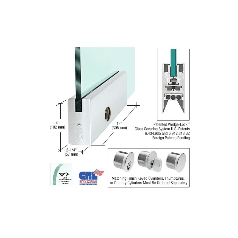 DR4SSA34PL CRL Profil de porte carr, avec serrure, 102 mm (4 po), verre de 19,1 mm (3/4 po) d'paisseur, de type plaque de 305 mm (12 po), anodis satin