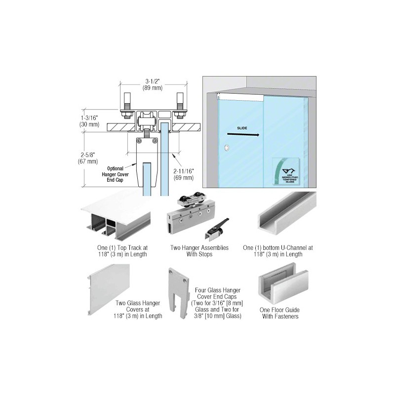 This configuration of the CRL50 Series Slider is used for single door with fixed panel in dropped ceiling applications. Satin anodized hanger covers and end caps are supplied with the kit to create a 'full rail' look while hiding the top roller bolt. Pull hardware ordered separately. Optional finishes can be ordered separately.