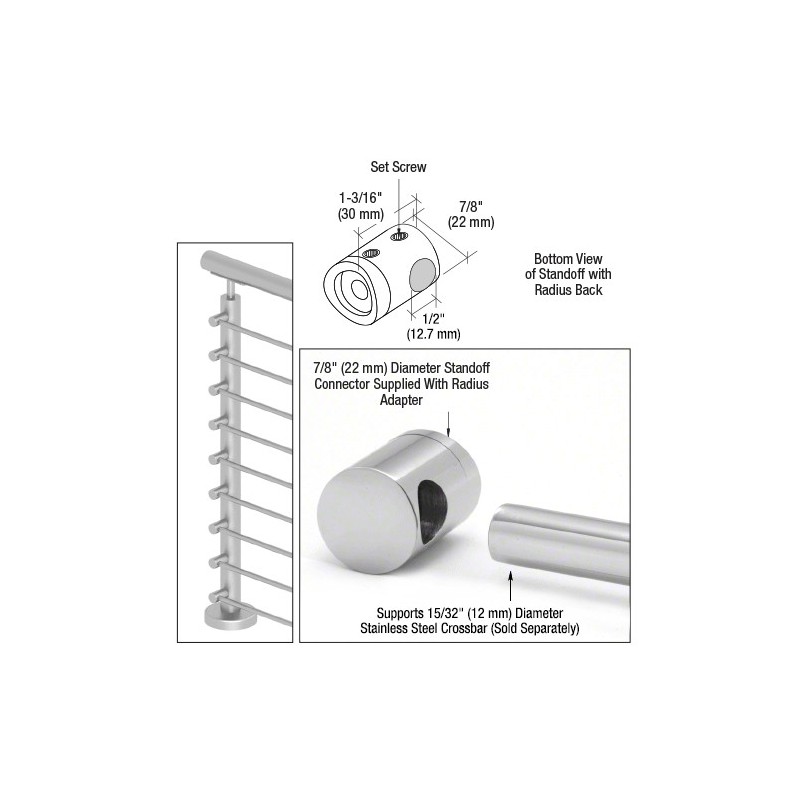 CRL's Stainless Steel Standoff Connectors are designed to support 12 mm diameter Stainless Steel Bar. Our easy slip fit design allows for clean seamless installations. No special welding or fabrication required. When attaching to the post use our Cat. No. SRB0LT 1/4"-20 x 1" (25 mm) bolt.