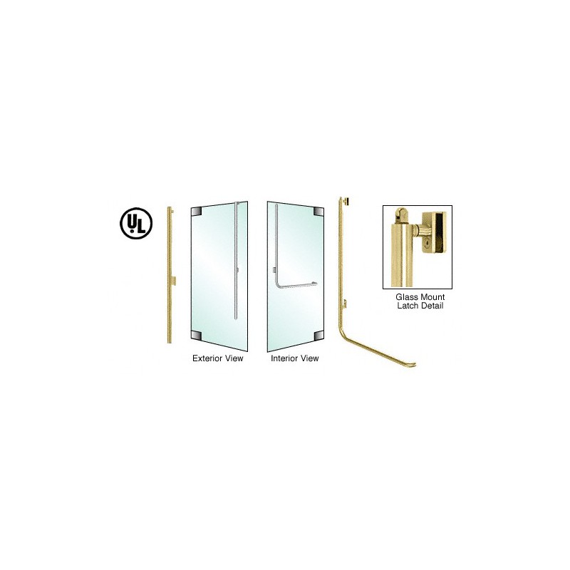3P100LS4GKBS CRL Poigne de porte extrieure, modle LS, antipanique, inverse, plaque de retenue, verrouillage en haut, fixation sur porte battante en verre, ct gauche, laiton satin