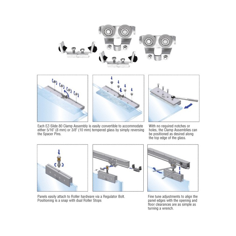 Ces roulettes et butées EZ-Slide 80 CRL sont conçues pour le rail supérieur EZ-Slide 80 CRL. Les deux roulements garantissent un fonctionnement silencieux et homogène. Ils sont conçus pour des panneaux n'excédant pas 80 kg (176 lb). La butée, dotée d'un butoir en caoutchouc, peut être installée et fixée sur toute la longueur du rail supérieur. Chaque kit contient deux roulettes et deux butées. Commande minimum : un ensemble.